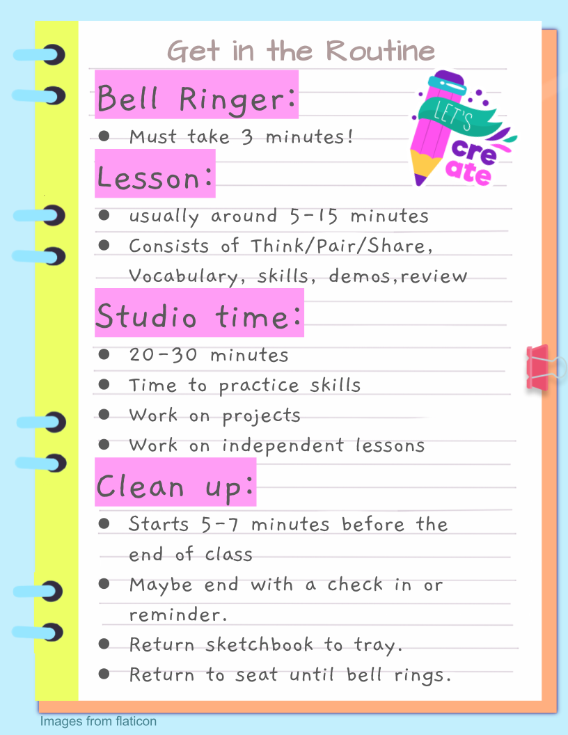 Design your sketchbook. It must be school appropriate. Please add color to make it your own! Take your time and take ownership, your sketchbook should be something you are proud of. Expectations: feel free to listen to music and look at references on your computer. Please remain seated and use the materials provided at your table.